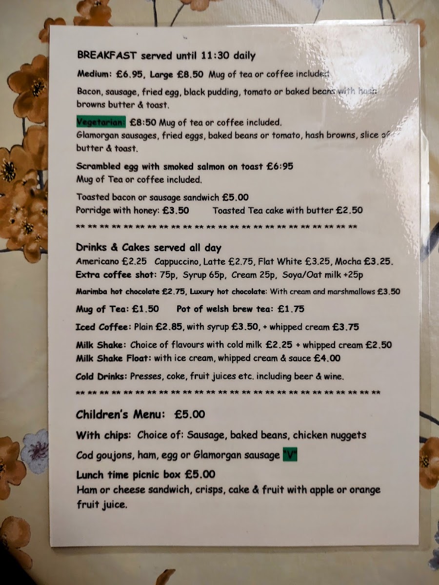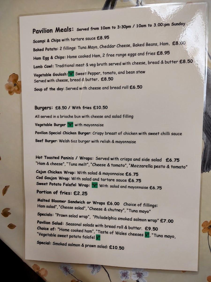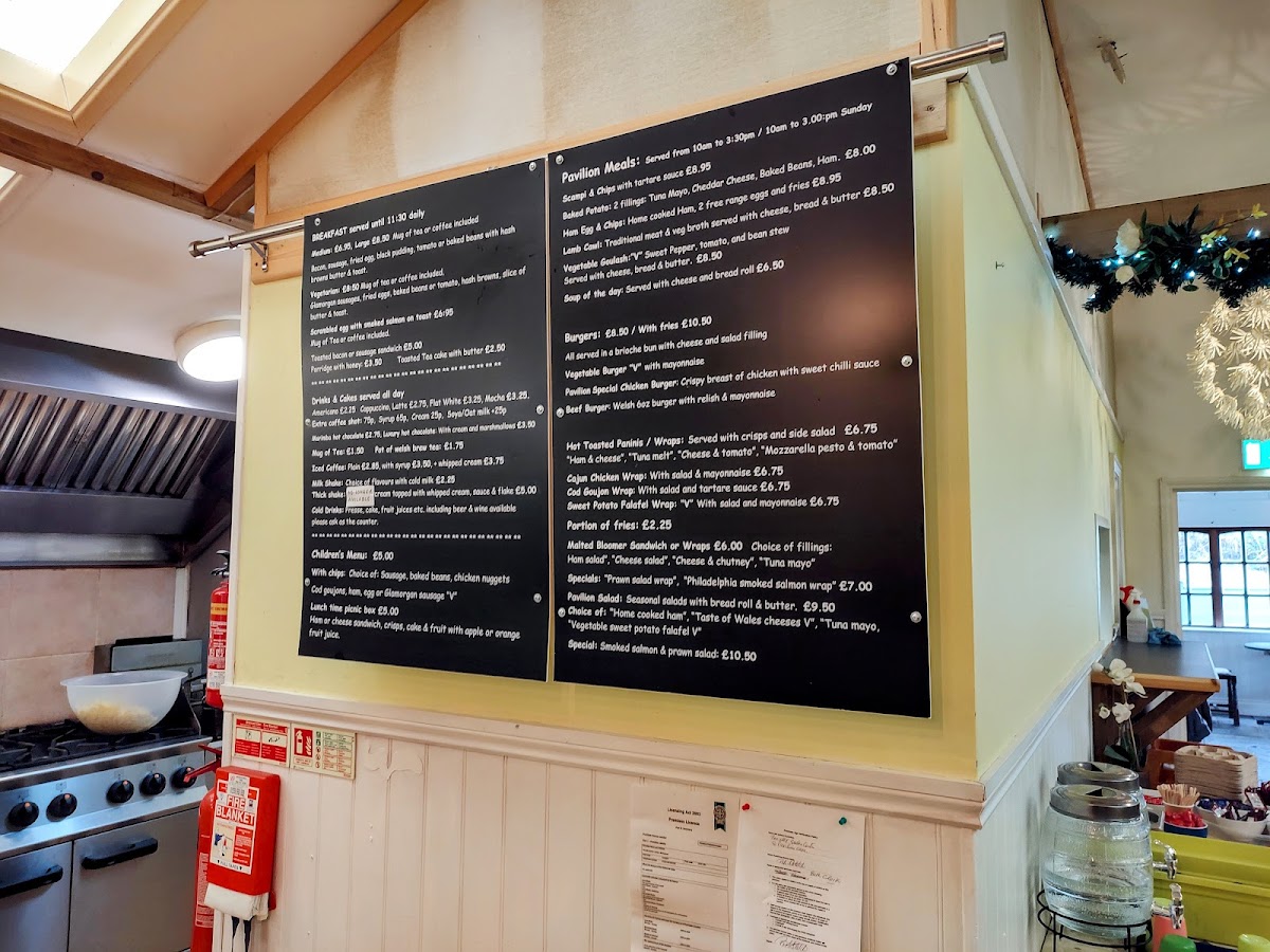 The menu at Penrallt Nursery offers a variety of dishes suitable for different tastes and times of the day. For breakfast, you can enjoy options like Scrambled Egg with Smoked Salmon on Toast or a classic Toasted Bacon or Sausage Sandwich. For a lighter option, the Porridge with Honey or a simple Toasted Tea Cake with Butter might be more appealing. The Pavilion meals include hearty choices like Scampi & Chips with Tartare Sauce, Baked Potato with Ham, Egg & Chips, and the comforting Lamb Cawl. Vegetarians will appreciate the Vegetable Goulash, while the range of burgers, including the Vegetable Burger, Pavilion Special Chicken Burger, and Beef Burger, cater to those craving a fulfilling meal. The menu also features hot toasted paninis and wraps, with options like the Cajun Chicken Wrap with Salad and Mayonnaise, Cod Goujon Wrap with Salad and Tartare Sauce, and the flavorful Sweet Potato Falafel Wrap. To complement these meals, a selection of drinks and cakes is available throughout the day, including popular choices such as Americano, Cappuccino, Marimba Hot Chocolate, and the indulgent Luxury Hot Chocolate. Whether you're stopping by for a full meal or just a quick coffee, Penrallt Nursery offers a warm, inviting menu with options for everyone.